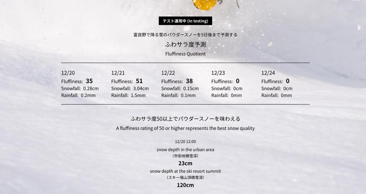 ホームページ上で市街地の積雪量とスキー場山頂での積雪量が見れるようになりました。 2023.12.17 富良野は本格的に雪が降り始めて、スキー場はスキーヤー、スノーボーダーで賑わっています。 是非、みなさまもbonchi powderを体感しにお越しください! 降雪に関しては「ふわサラ」度で予測出来たのですが積もっている雪「積雪量」に関しての記載がありませんでしたので、公式ホームページにリアルタイムの降雪量を表示するように変更いたしました。 是非ご利用ください♪